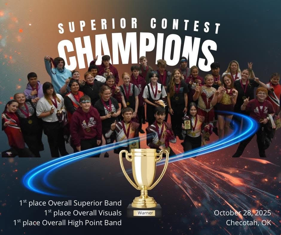 The Pride of Warner Marching Band wrapped up their contest season today with their biggest win yet — 1st Overall High Point Band out of 13 area bands competing from 2A–4A classifications!
